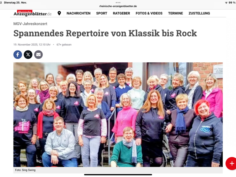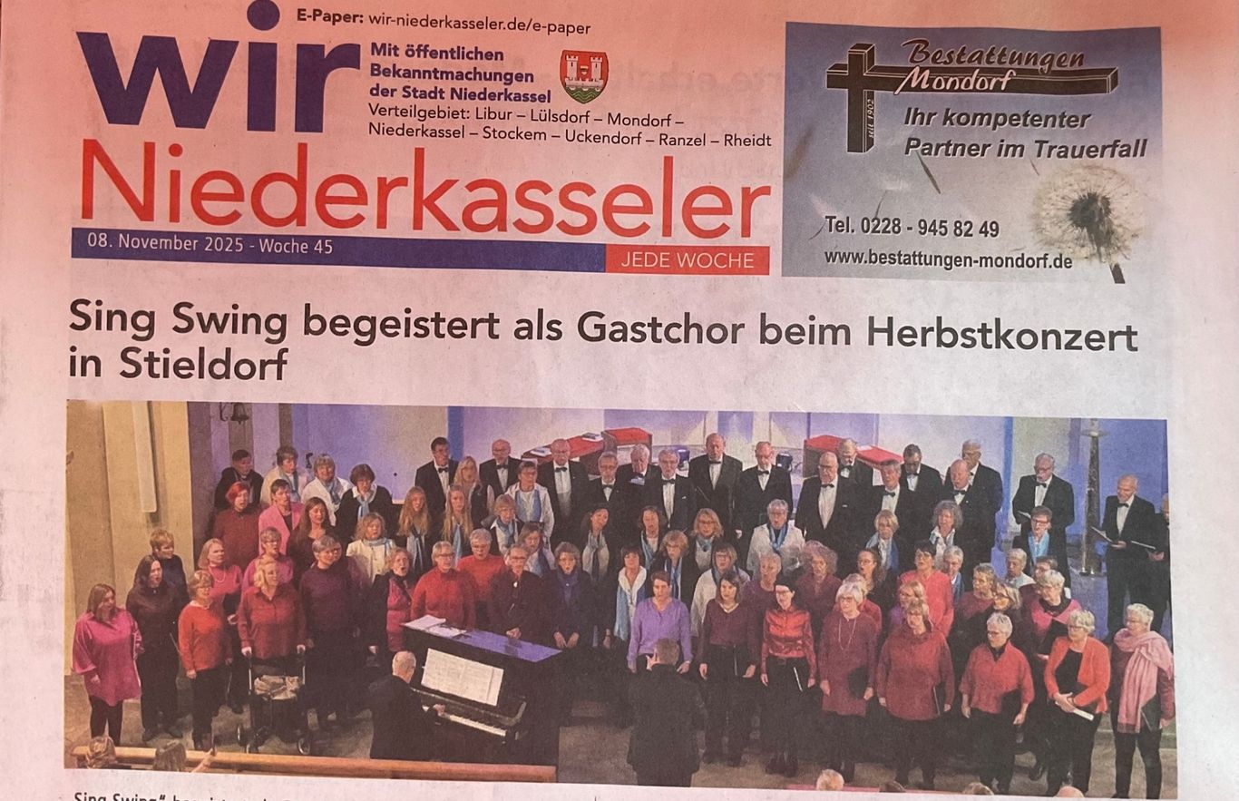 Bestens vorbereitet freut sich Sing Swing nun auf das große Jahreskonzert des MGV 1849 Rheidt e.V. am 30. November 2025 um 17.00 Uhr im Saal „Zur Linde“ in Rheidt. Dort erwartet die Gäste bester Chorgesang dreier Chöre in vielfältigen Facetten. Allein die Eröff-nung mit allen Chören und dem imposanten „Conquest of Paradise“ verspricht, ein Erlebnis zu werden. Nach der gelungenen Koopera-tion 2024 werden zudem Männerchor und Sing Swing auch dieses Jahr ihre Stimmen für ein Stück op Kölsch vereinen. Karten für das MGV-Jahreskonzert gibt es bei Garteninsel Wipperfürth, Reisebüro P. Sültenfuß und an der Abendkasse. Mit der offenen Chorprobe „Family & Friends“ beendet Sing Swing das Chor Jahr. In gemütlicher Atmosphäre kann man dann noch einmal Sing Swing bei der Arbeit zusehen und -hören: am Donnerstag, 11. Dezember 2025 um 19.30 Uhr im Roncalli Haus, Pastor-Grimm-Straße in Niederkassel.