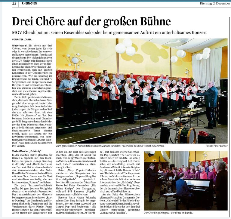 Hierzu allen ein herzliches Willkommen“, begrüßte Jürgen Grohs, Vorsitzender des Männer-Gesang-Vereins Rheidt, die zahlreich erschienen musikinteressierten Niederkasseler. Im restlos ausverkauften Saal „Zum Lüches“ wurde dieses Motto auch gleich zu Beginn des Konzertes gemeinsam von dem Frauen- und Männerchor klangvoll intoniert.