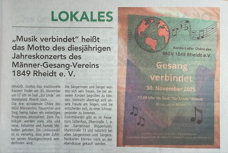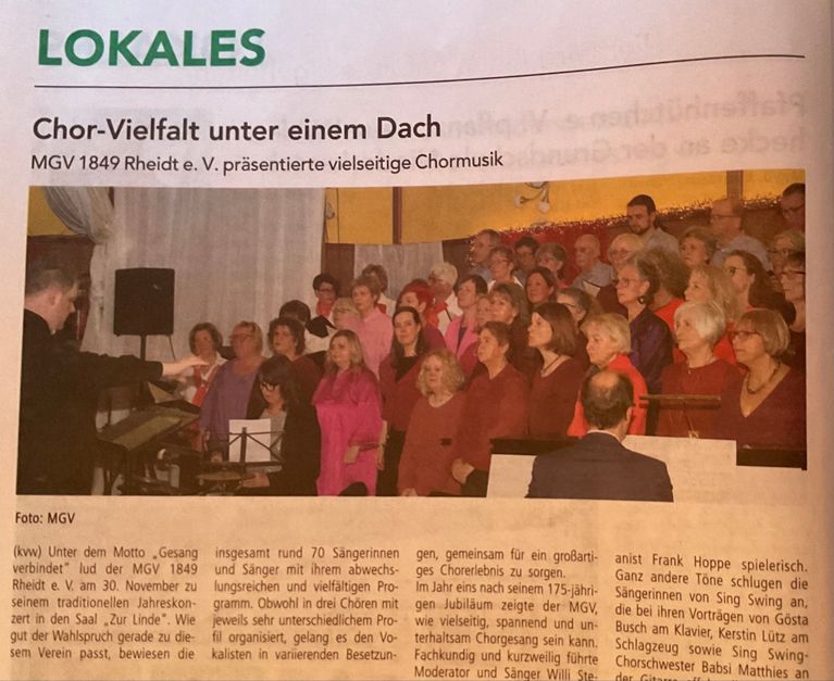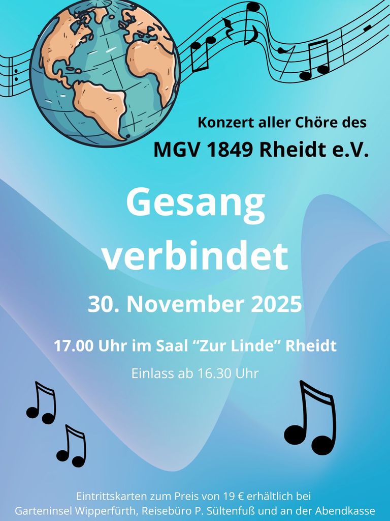 heisst das Motto des diesjährigen Jahreskonzerts des Männer -Gesang-Vereins 1849 Rheid t e.V. Das traditionelle Konzert findet am 30.November 2025 um 17.00 Uhr im Saal "Zur Linde" am Marktplatz Rheidt statt. Die drei einladende Chöre des MGV Männerchor, Frauenchor und Sing Swing haben ein vielseitiges Programm einstudiert. Dem Publikum werden viele alte und neue, bekannte und fremde Melodien geboten. Die Liedauswahl ist so vielseitig, dass jeder Zuhörer seinen Musikgeschmack wieder-finden wird.